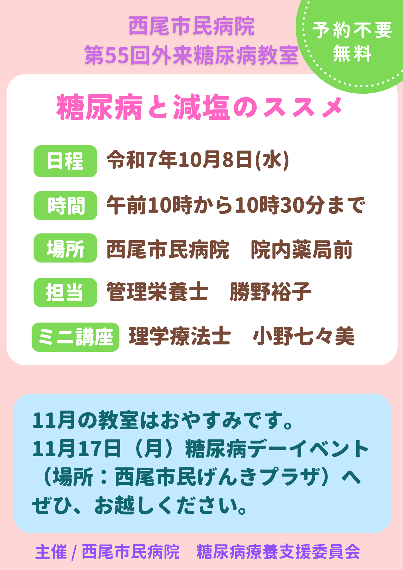 次回第55回の開催内容は当院 管理栄養士による「糖尿病と減塩のススメ」です。是非お気軽にご参加ください。多数の皆様のご参加お待ち申し上げております。
