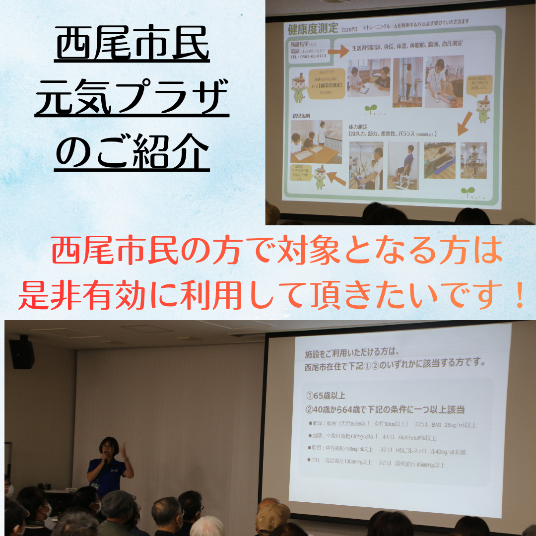 また会場である西尾市民げんきプラザの2階の運動施設の見学も随時していただき、講演の最後には施設スタッフの方に施設の紹介を行っていただく事で、施設を知っていただく機会にもさせていただきました。