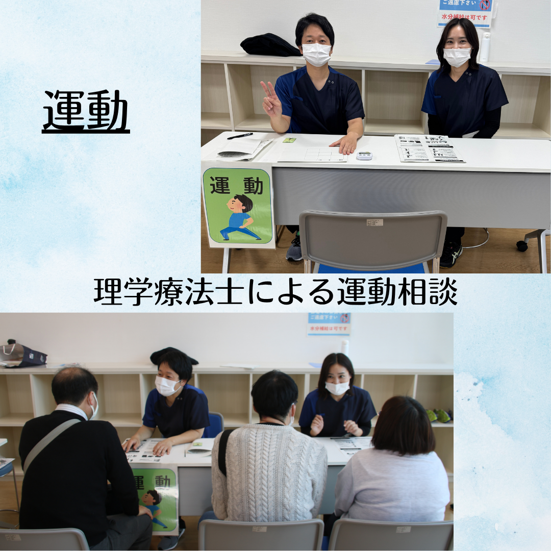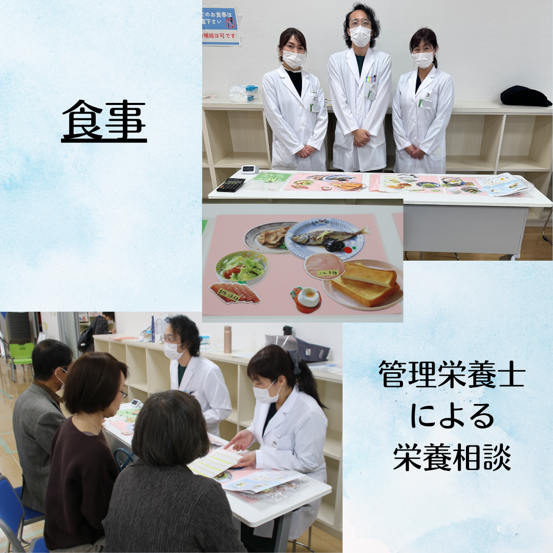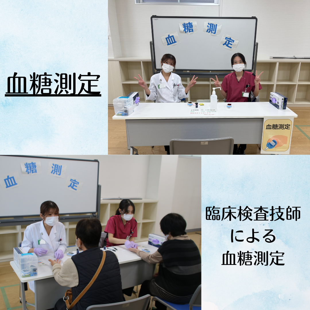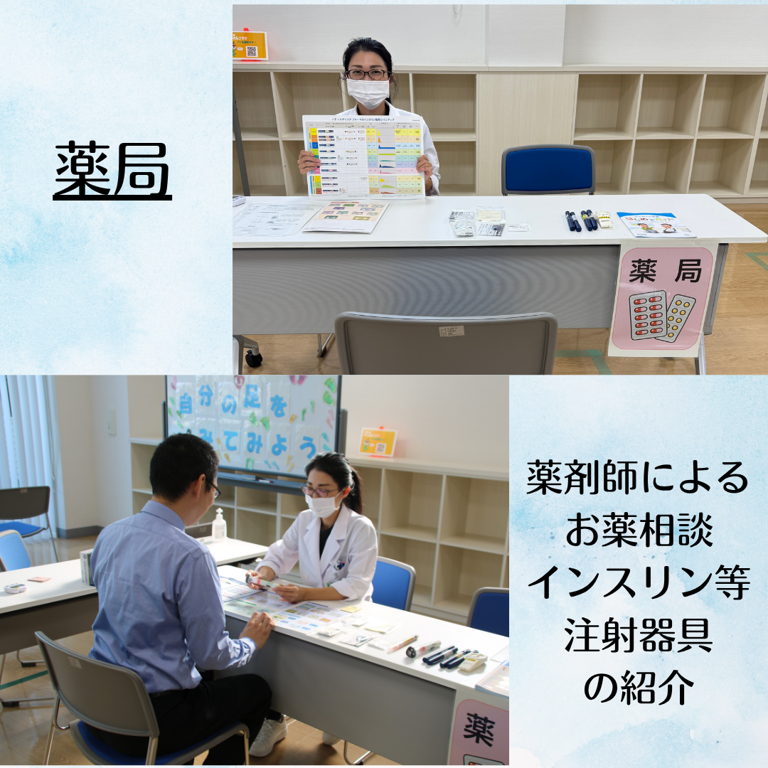 講演の前後では会場に用意しました血糖測定・薬局・運動・フットケア・食事のブースにて、臨床検査技師・薬剤師・理学療法士・看護師・管理栄養士による測定や相談を受けさせていただきました。